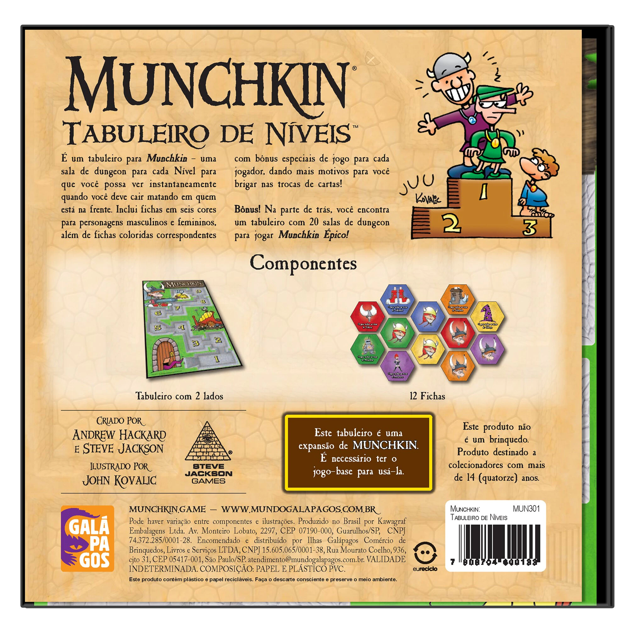 Munchkin: Tabuleiro de Níveis é um tabuleiro para Munchkin – uma sala de dungeon para cada nível, além de espaço para os baralhos e os descartes, para que você possa ver instantaneamente quando você deve cair matando em quem está na frente. Inclui fichas em seis cores para personagens masculinos e femininos, e fichas coloridas correspondentes com bônus especiais de jogo para cada jogador, dando mais motivos para você brigar nas trocas de cartas.